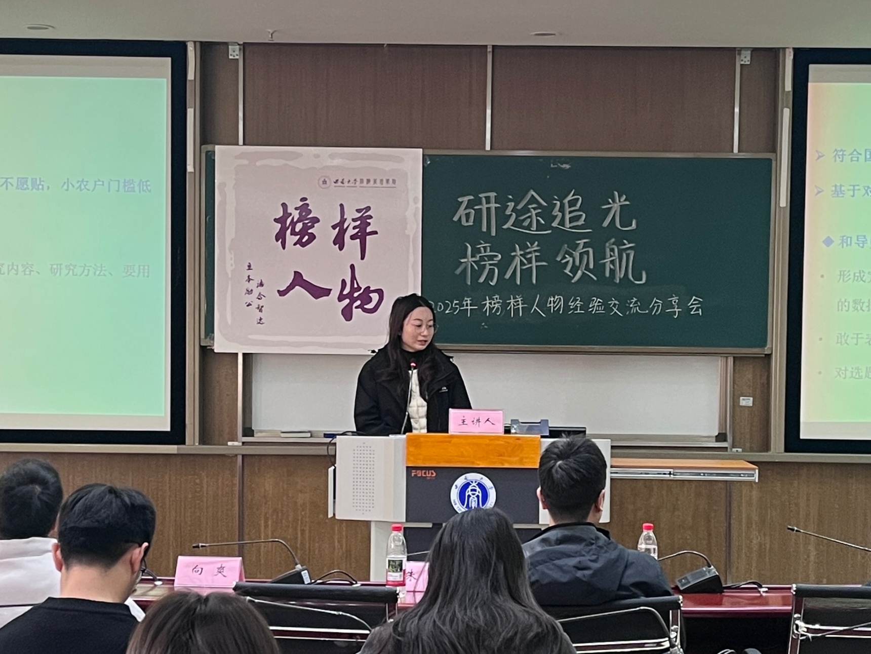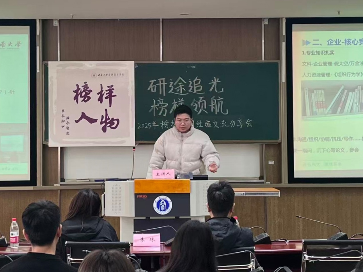 榜样是划破迷茫的星火,是照亮征途的路标,更是青年一代逐梦路上最鲜活的参照。为深入学习贯彻习近平新时代中国特色社会主义思想,全面落实立德树人根本任务,充分发挥优秀学子的示范引领作用,11月28日下午,研究生榜样人物经验交流分享会在公司B203教室顺利举办。本次活动以“研途追光 榜样领航”为主题,邀请三位国家奖学金获得者进行分享,分别为2024级农业经济管理专业博士研究生朱珠同学、2023级企业管理专业硕士研究生向爽同学、2023级农业管理专业硕士研究生黄文鹏同学。