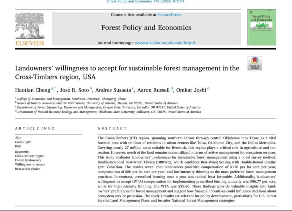 其中,发表于 Forest Policy and Economics的论文“Landowners' willingness to accept for sustainable forest management in the Cross-Timbers region, USA”探讨了林地主对可持续经营政策的接受意愿;另一篇论文“Understanding how urban communities make trade-offs between forest management and ecosystem service objectives”则聚焦城市居民在森林管理与生态系统服务间的偏好权衡。这两项研究从不同群体视角揭示了社会行为与森林政策之间的互动机制,为全球森林治理与生态补偿政策设计提供了实证支持。与此同时,程昊天与南京林业大学合作发表的论文“Are There Spatial Spillover Effects of Carbon Emission Trading Policy on Forest Carbon Sink Growth in China?”发表于Forests,研究发现碳排放交易政策在促进碳汇增长的同时,还具有显著的空间溢出效应,为碳市场的生态协同效应提供了新证据。