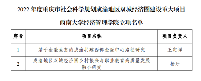 重庆市申报项目经成渝两地专家评审,重庆市社科联审核,并报重庆市委宣传部批准,本次共计立项15项。公司王定祥教授和杨丹教授申报的项目均获准立项。