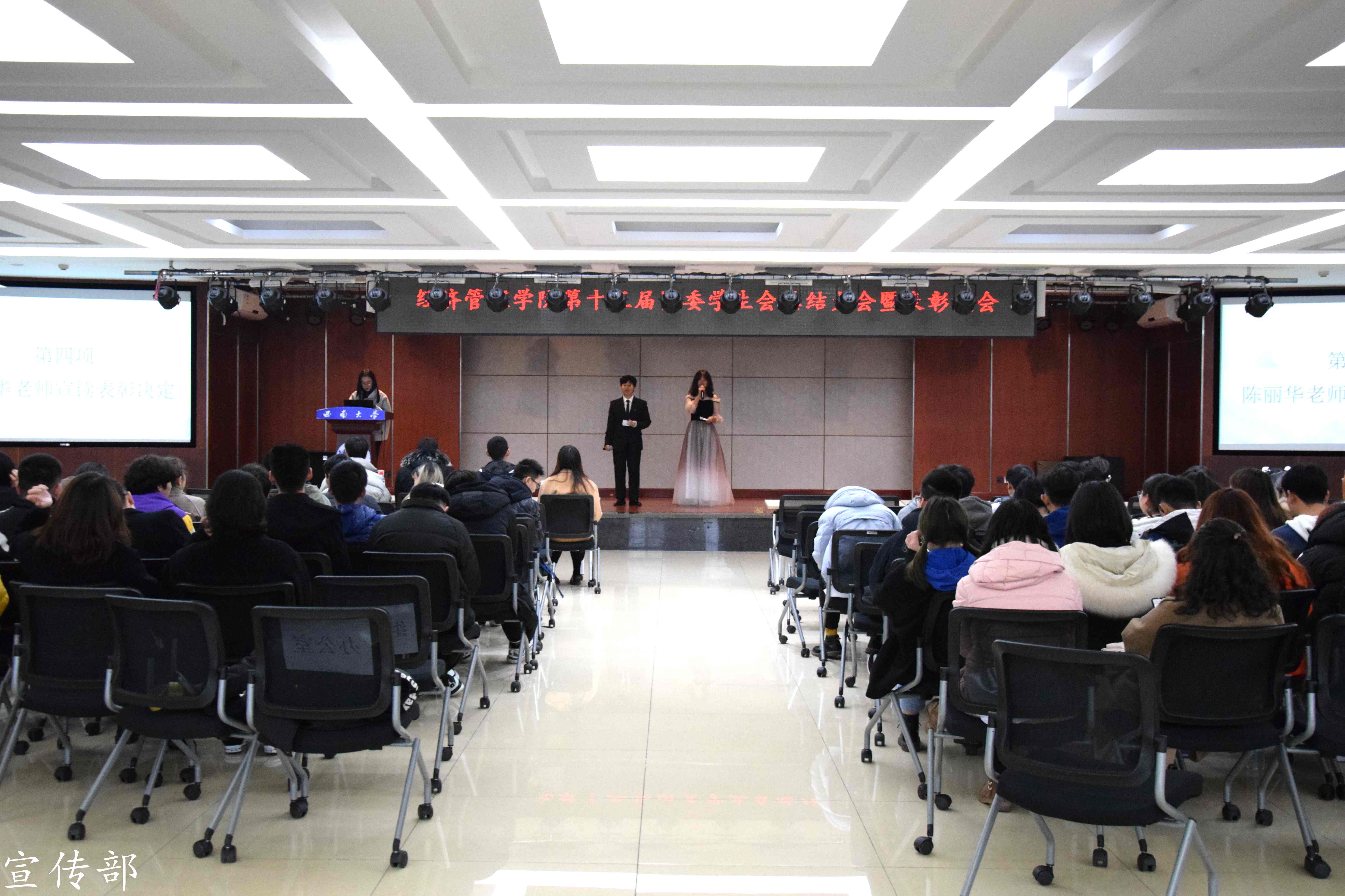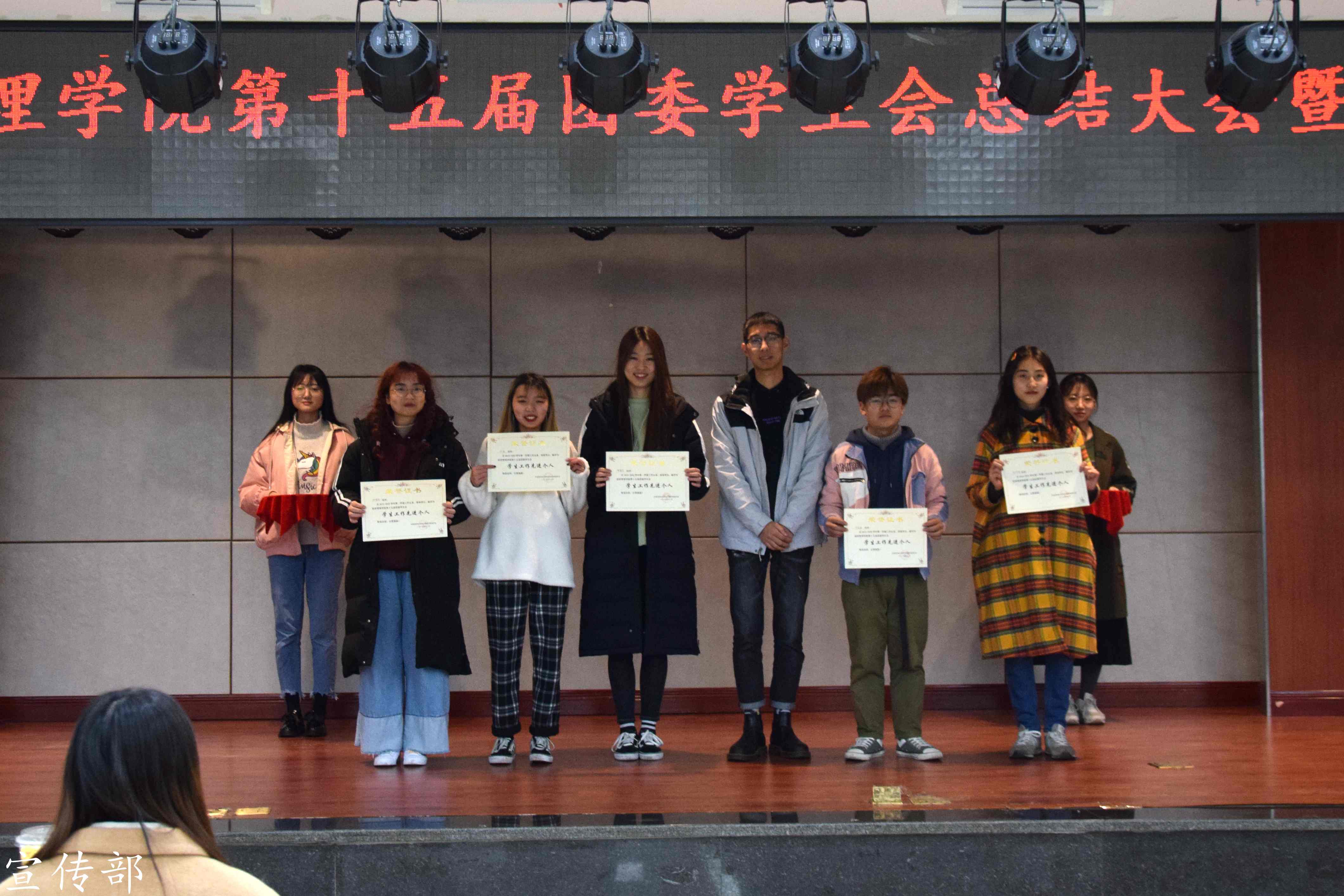 最后,团委副书记刘博闻同学宣读表彰决定,其中5位部长和16名委员获得“员工工作先进个人”称号,宣传部和新媒体中心荣获2019-2020学年第一学期伟德国际VICTOR1946团委员工会“优秀部门”。在全场的掌声中,团委员工会主席团为受表彰个人及集体颁奖。
