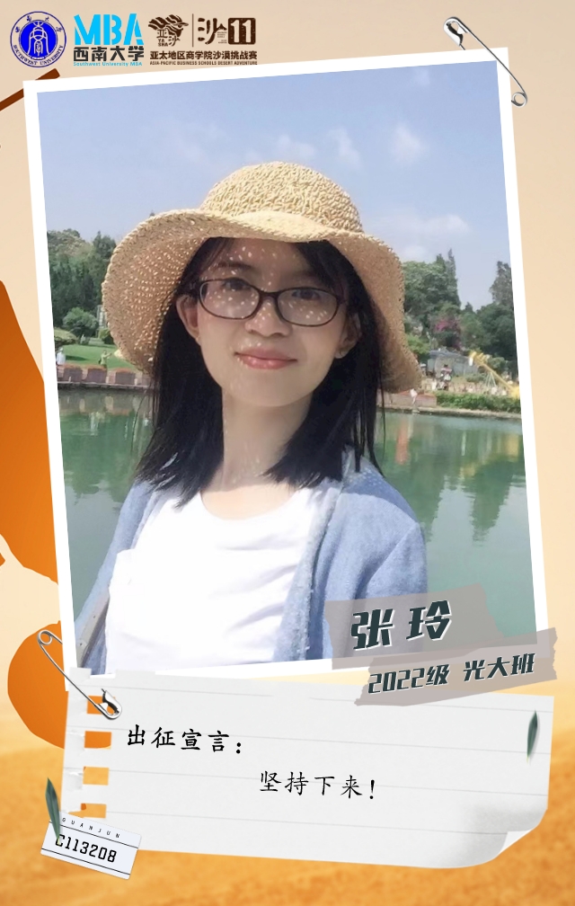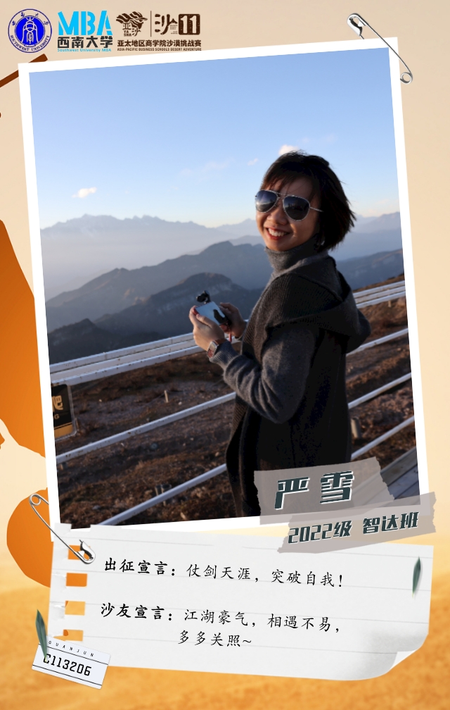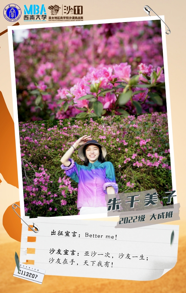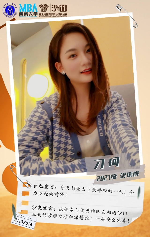 她是一个在MBA开学线下活动中,听天生i跑俱乐部发起人刘文宏宣讲亚沙后,被赛事深深吸引而加入俱乐部的温柔女孩。她从不爱跑步到报名挑战沙11,强身健体的同时,只为和沙友一起在沙漠中并肩前行!