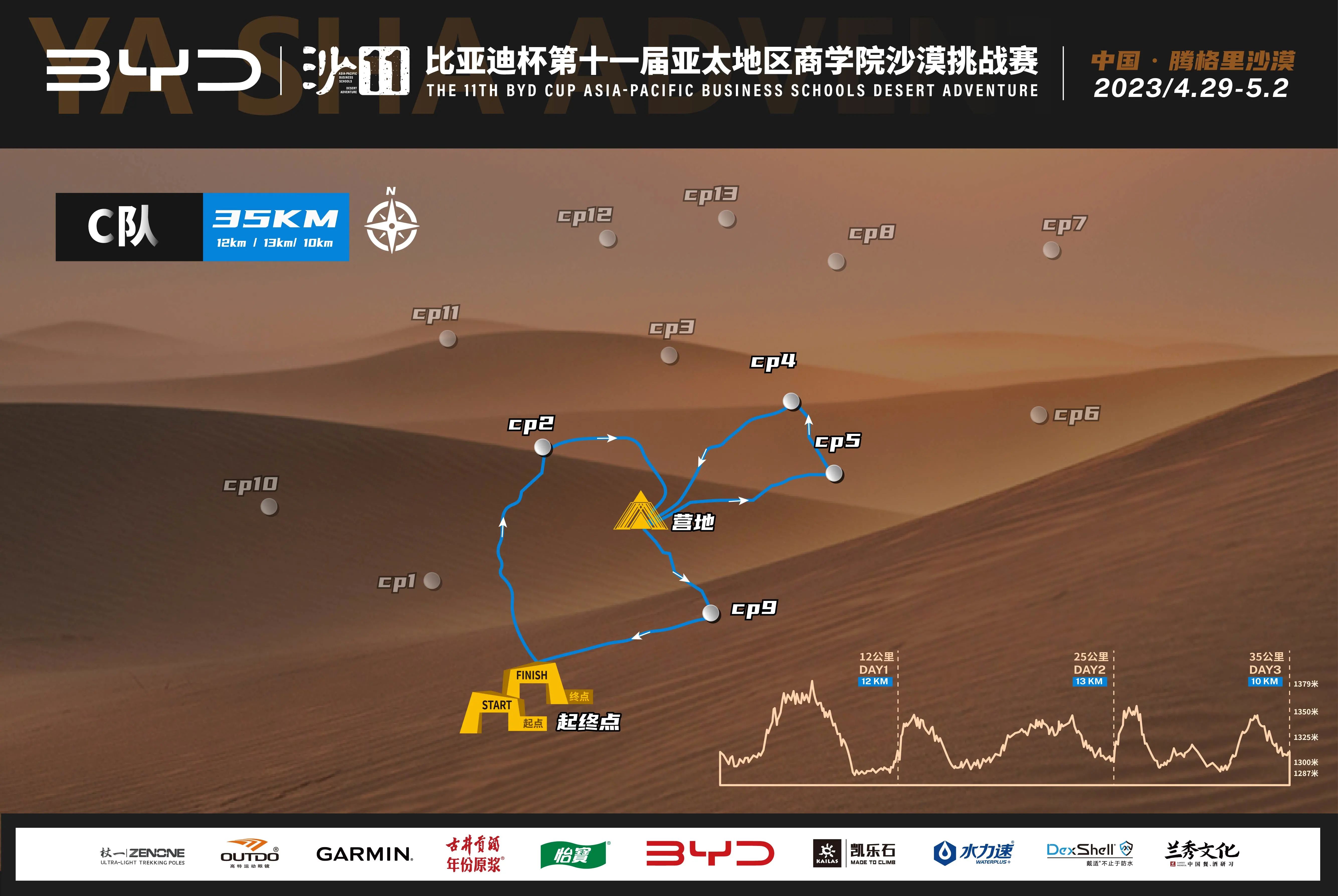 赛道描述:与AB队赛道分开,进入C队独立赛道。连续中大沙丘地形,需翻越沙丘,在沙漠中完成对自我和自然的挑战,强烈建议准备登山杖。