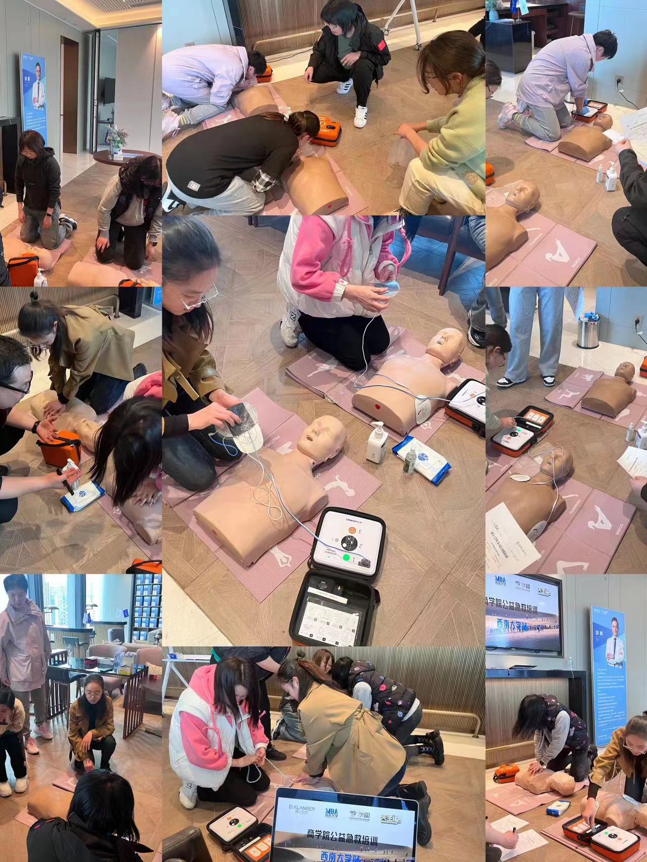 本次活动由亚沙公益中心的岳双平老师授课,他通过讲解加示范的形式,为大家培训了CPR(心肺复苏)+AED(自动体外除颤器)施救、气道异物梗阻的急救、常见急症、创伤救护等理论内容。