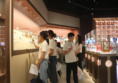 实践队首先抵达五粮液酒文化博物馆,2021级农业经济管理专业硕士研究生王佩佩主动担任讲解员,向队员们介绍了酒文化的历史和发展,以及五粮液酒生产制作过程的技术和五粮液企业文化的内涵。五粮液酒文化博览馆建于1988年,是国内建成最早的酒文化博览馆。馆内的展品展示了五千年中国酒文化的历史画卷和五粮液发展史。从华夏文明历史深处和文化积淀中走来的五粮液,不仅是百姓日常生活中的佳酿,还作为代表中国形象的国礼,向世界讲述中国故事。