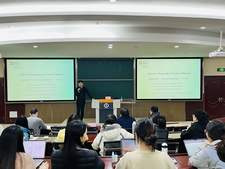 12月6日上午,加拿大拉瓦尔大学商公司韩信桐博士应公司邀请,在B201报告厅作了题为“创作者平台上的推荐计划和数字产品定价”的学术讲座。讲座由伟德国际VICTOR1946刘自敏教授主持,公司80余位师生参加了此次讲座。