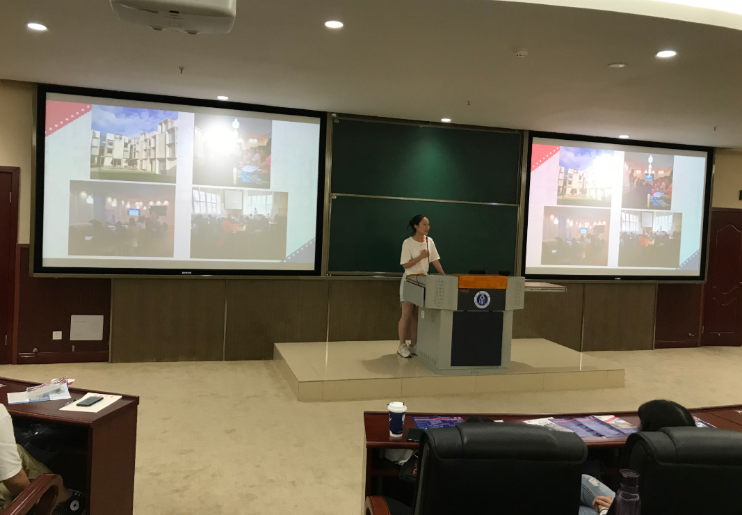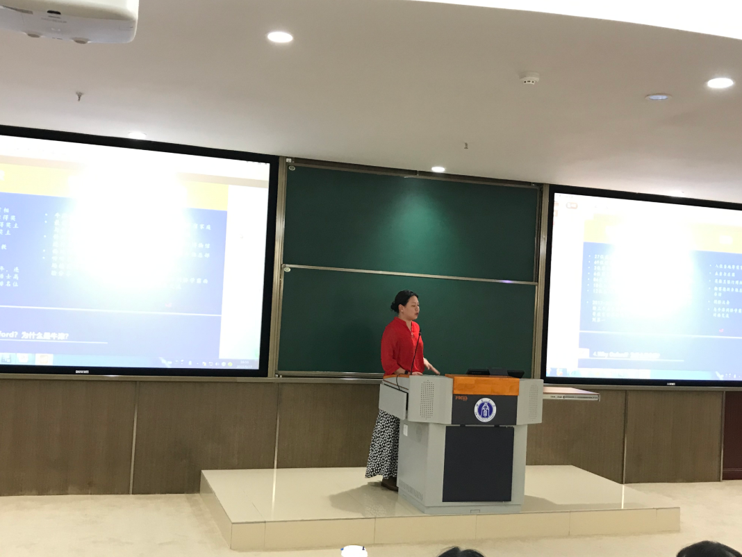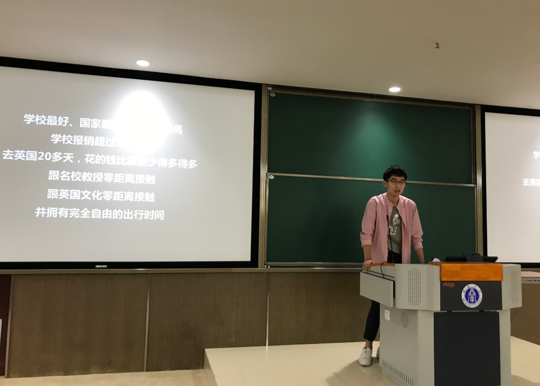 紧接着,由暑期参加牛津访学项目的优秀员工代表姜子恒和胡楠同学为大家分享了他们在访学期间的所见所感。两位同学从学习感受、生活体验、心态变化几方面用风趣幽默的讲述方式结合大量游学期间的精彩合影,生动的展现了本次访学之感,期间分享的各种游学囧态和趣闻引得同学们哄堂大笑。