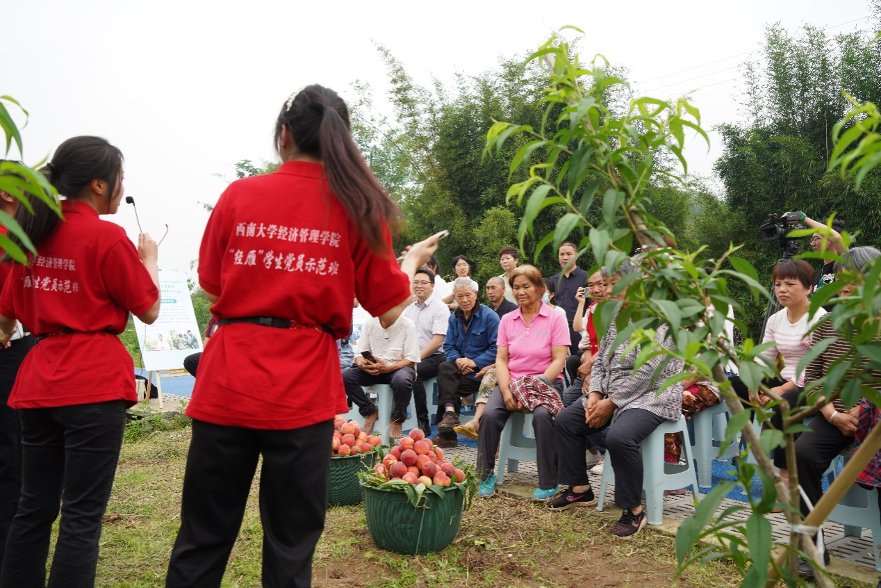 近日,位于重庆北碚三圣镇德圣村的蜜桃科技小院迎来了丰收,在这个桃农采摘和套袋的繁忙季节,公司“经雁”员工党员示范班成员在公司党委宣传部、党委网络工作部的指导下,创新宣讲方式,把讲台搬到桃园里,利用科技小院师生和果农的休息时间,向他们传递党的“好声音”。