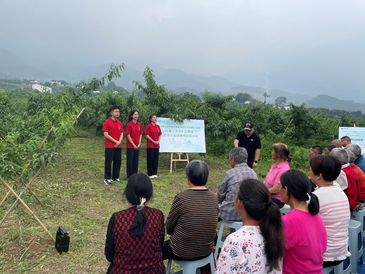 此次宣讲,示范班成员还带来了歌曲《在那桃花盛开的地方》《太阳出来喜洋洋》《我和我的祖国》,用歌声表达丰收的喜悦。富有节奏感的音乐和朗朗上口的歌词,让科技小院的师生和果农们也跟着应和,果园里爆发出阵阵掌声和欢呼声。