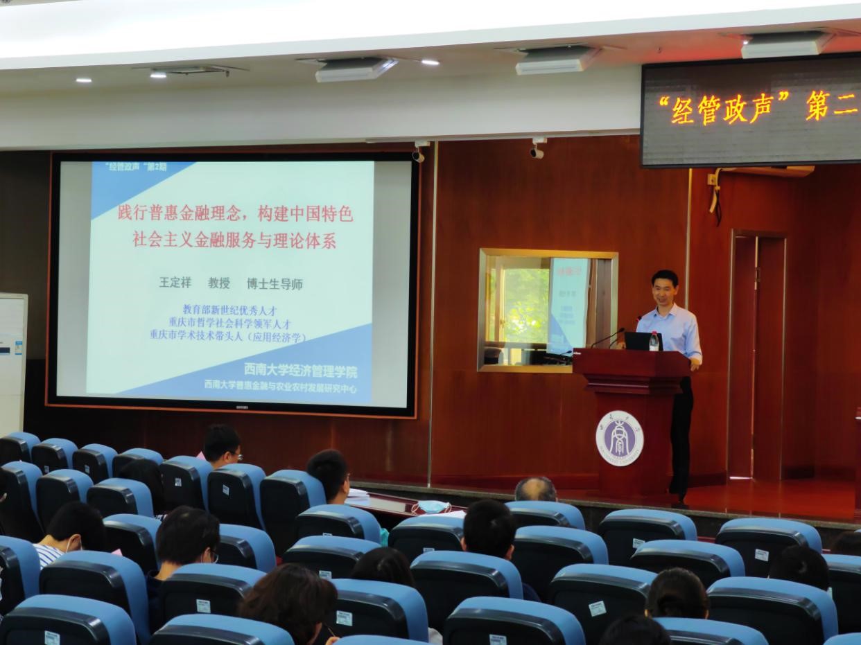 公司金融系党支部书记、系主任王定祥教授以《践行普惠金融理念,构建中国特色社会主义金融服务与理论体系》为题,作“经管政声”第二讲。王定祥从重新认识金融的表象与里子、普惠金融理念的核心意涵、普惠金融的中国政治经济学分析、中国金融的发展趋势、构建中国特色社会主义金融服务体系与学科体系等5个方面,介绍了“金融”“普惠金融”的内涵、特征、功能、目标等内容;指出增强金融普惠性与中国共产党以人民为中心的执政理念高度吻合,是实现社会主义大家庭和谐、团结、进步、共同富裕的重要支柱,体现了社会主义制度相比资本主义制度的优越性,必将成为中国共产党执政的重要政策工具;强调“回归本源、增强普惠性”将成为中国金融的发展趋势;倡导践行普惠金融理念,构建中国特色社会主义经济金融理论,完善为人民服务的金融服务体系以及以人民为中心的金融学科体系。