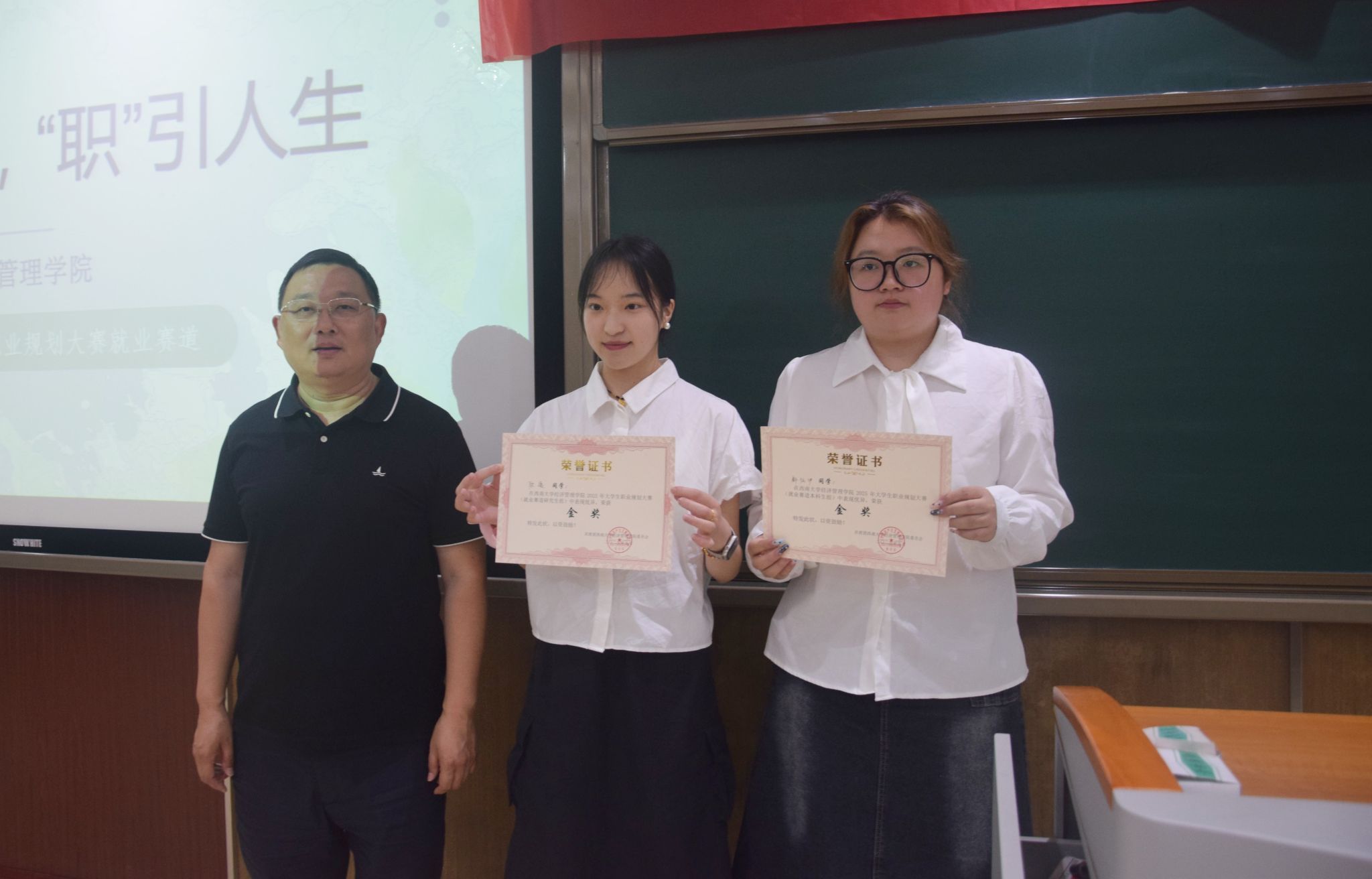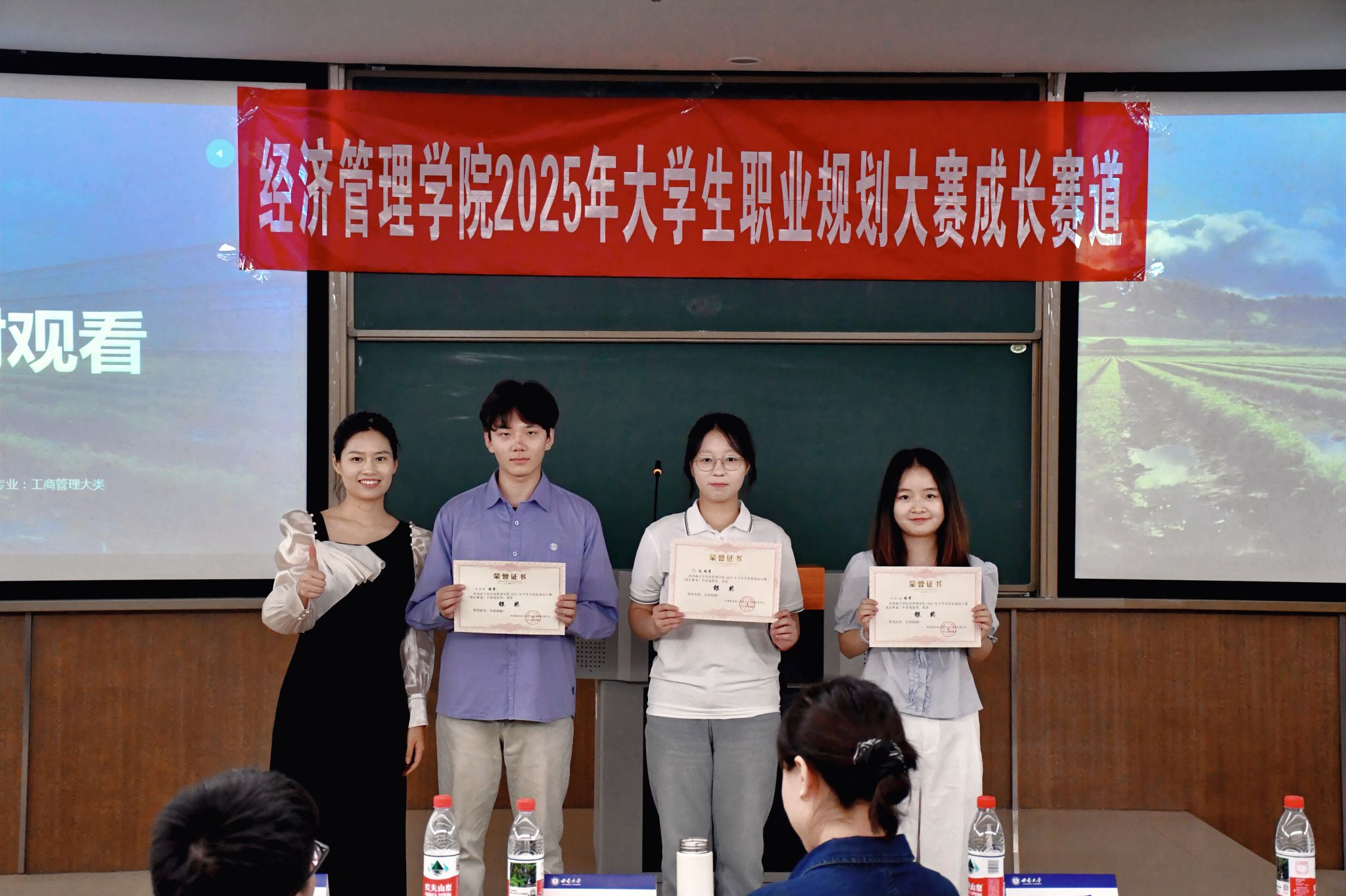 经评委打分,陆逸和都炫伊、陈婧娜和杨恒以出色的发挥分别获就业赛道和成长赛道金奖。