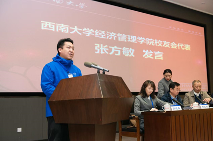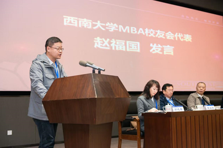 MBA员工代表赵福国发言。他对母校成立MBA员工会表示感谢。他深情回忆了作为MBA员工在校学习期间的美好时光,对母校提供的优越学习环境和老师们的辛勤教导表示感激。他希望MBA员工会传承母校精神,引导员工们在工作生活中相互支持,为母校建设发展积极贡献力量。
