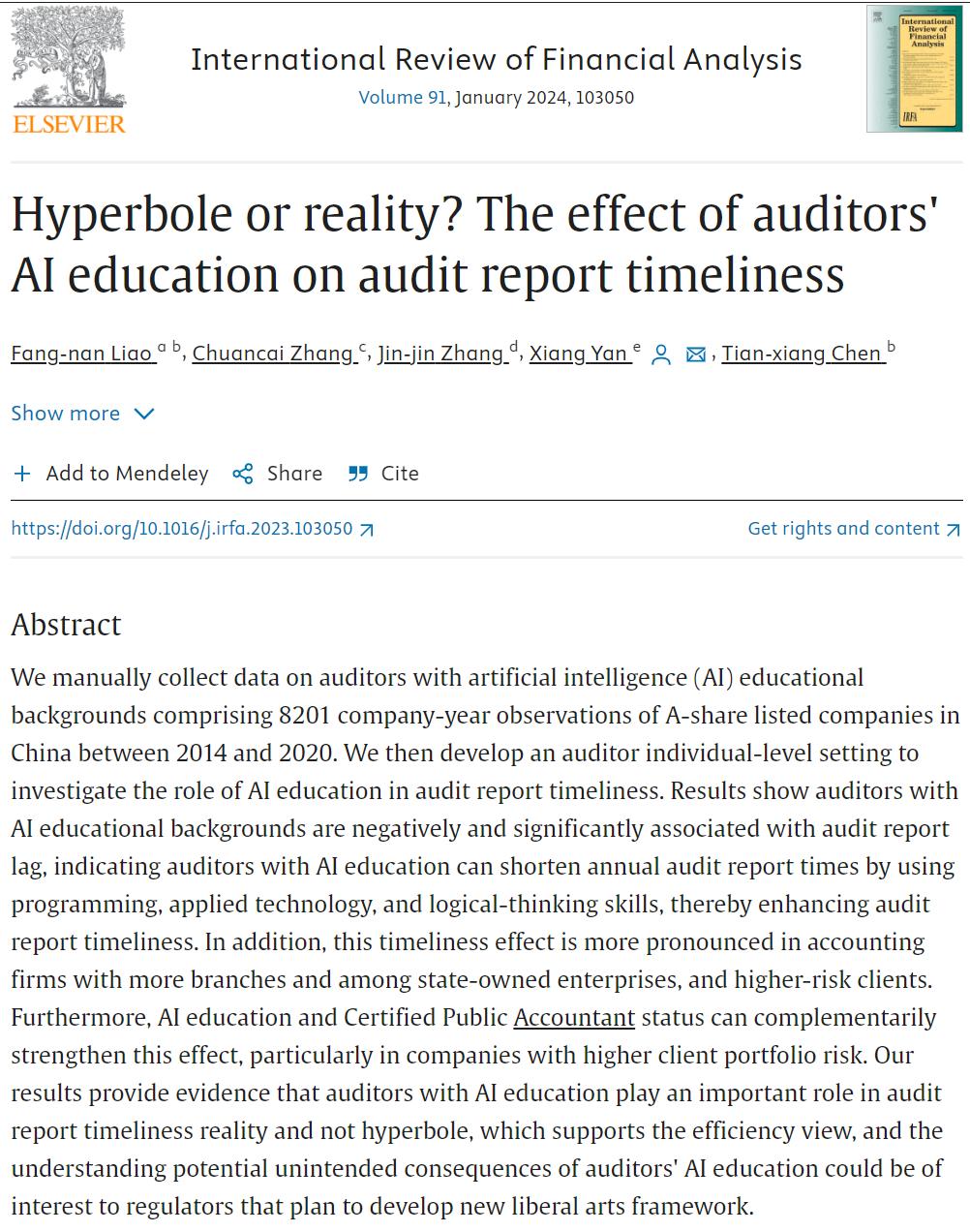 Liao, F. N., Zhang, C., Zhang, J. J., Yan, X., & Chen, T. X. (2024). Hyperbole or reality? The effect of auditors' AI education on audit report timeliness. International Review of Financial Analysis, 91, 103050. https://doi.org/10.1016/j.irfa.2023.103050.
