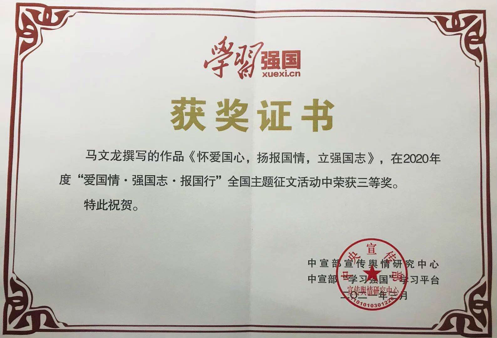 近日,中宣部“学习强国”学习平台公布了“爱国情·强国志·报国行”主题征文获奖结果。本次征文面向全国共征集到作品20.1万多篇,在各省级学习平台评选、推荐的基础上,筛选出3300件优秀作品,经过专家评审团队严格的初评、复评,评选出获奖作品865篇。公司2020级会计学硕士研究生马文龙撰写的征文《怀爱国心,扬报国情,立强国志》荣获全国三等奖。