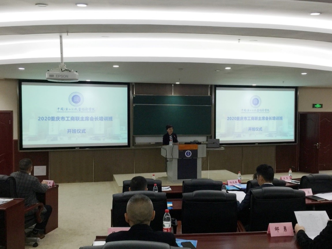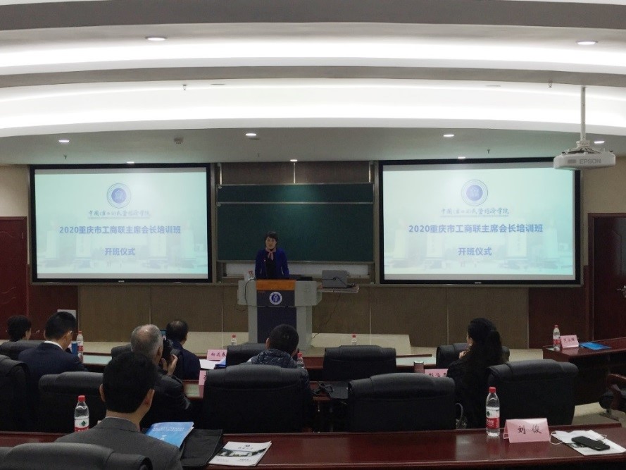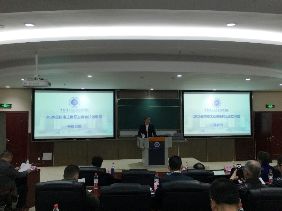 重庆市工商联党组副书记、副主席张莉同志代表市工商联讲话,张莉特别强调,举办这次培训班是为了深入贯彻习近平总书记在企业家座谈会上的讲话精神,认真落实陈敏尔书记在重庆企业家座谈会上的指示要求;是为了深入学习贯彻十九届五中全会精神,帮助民营企业认清经济形势,把握发展态势,进一步激发全市民营经济发展活力,有效促进民营经济高质量发展;是为了在重庆锻造一支有爱国情怀,勇于创新,有责任担当和国际视野的企业家队伍。张莉还对受训的民营企业家提出了严守学习纪律,确保学习质量的要求,并预祝培训班取得实效。