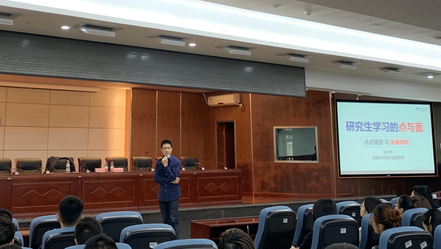 公司王小华副教授在专题讲座研究生学习的点与面中,以自己与三位朋友的学术生涯为实例向全体新生阐述了不一样的勤奋,四种不同的人生的故事。进而从研究生如何养成良好习惯、如何阅读文献资料、如何着手写作论文、如何培养创新精神以及如何调整好学习心态等五个方面,结合自身科研经历,用风趣幽默的语言向研究生强调培养良好习惯的重要性,勉励研究生刻苦钻研,不断提高学术研究的能力和水平。