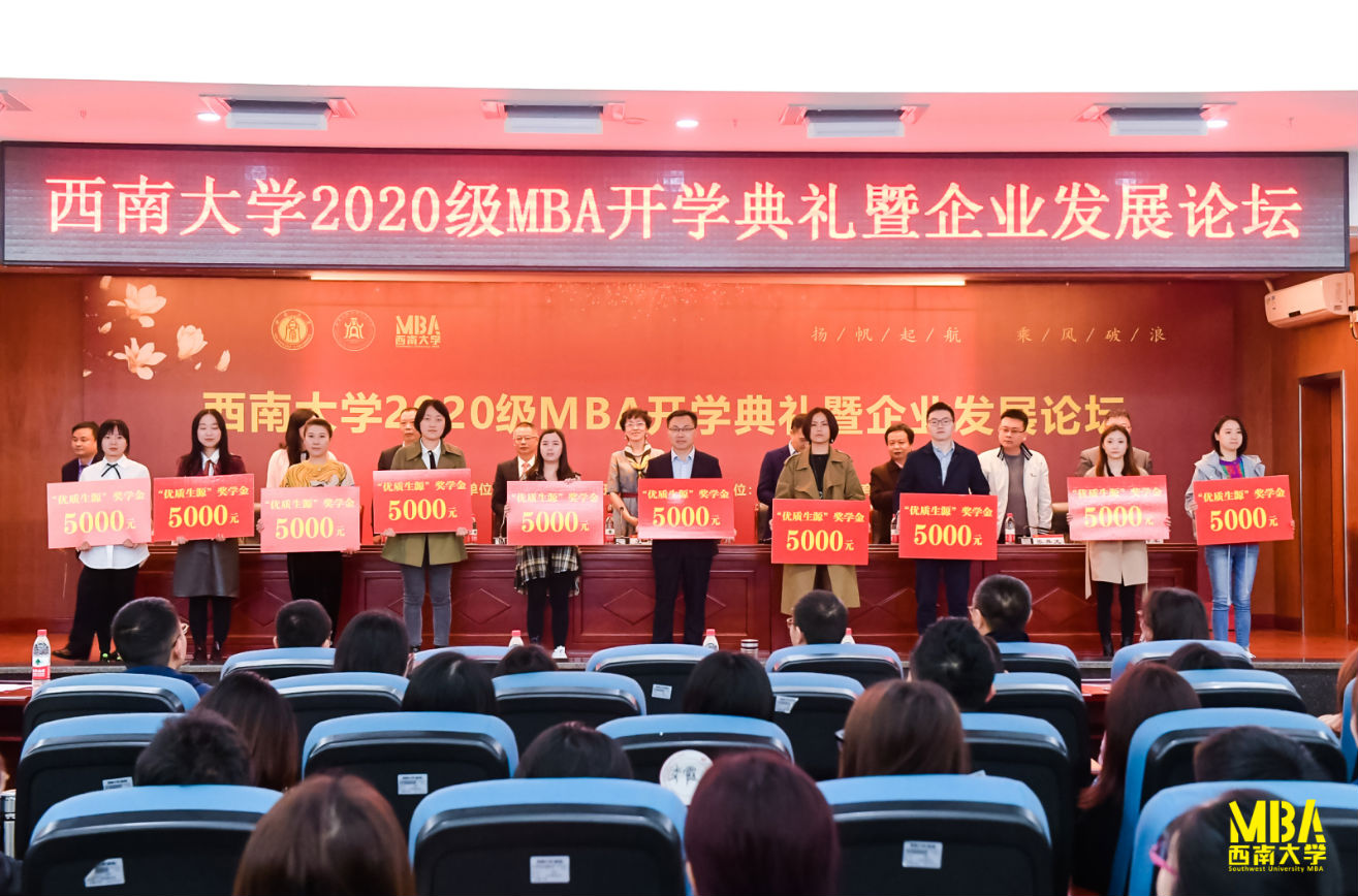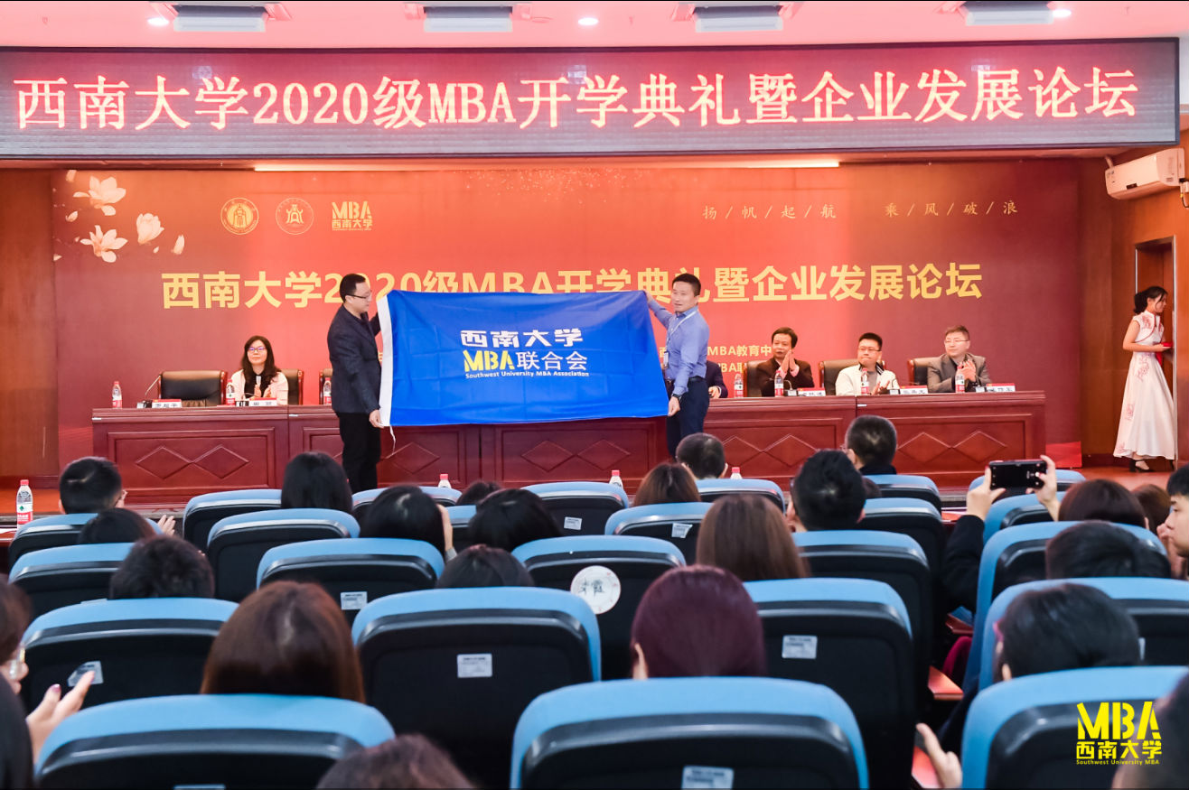 典礼上,出席典礼的主席台领导还为21名2020级MBA新生颁发了“优质生源”奖学金和“英才计划”奖学金,并为第九届MBA联合会成员代表颁发聘书。随后,举行了庄重的MBA联合会授旗仪式,MBA教育中心副主任王双龙副教授向第九届联合会刘文宏主席同学授旗。