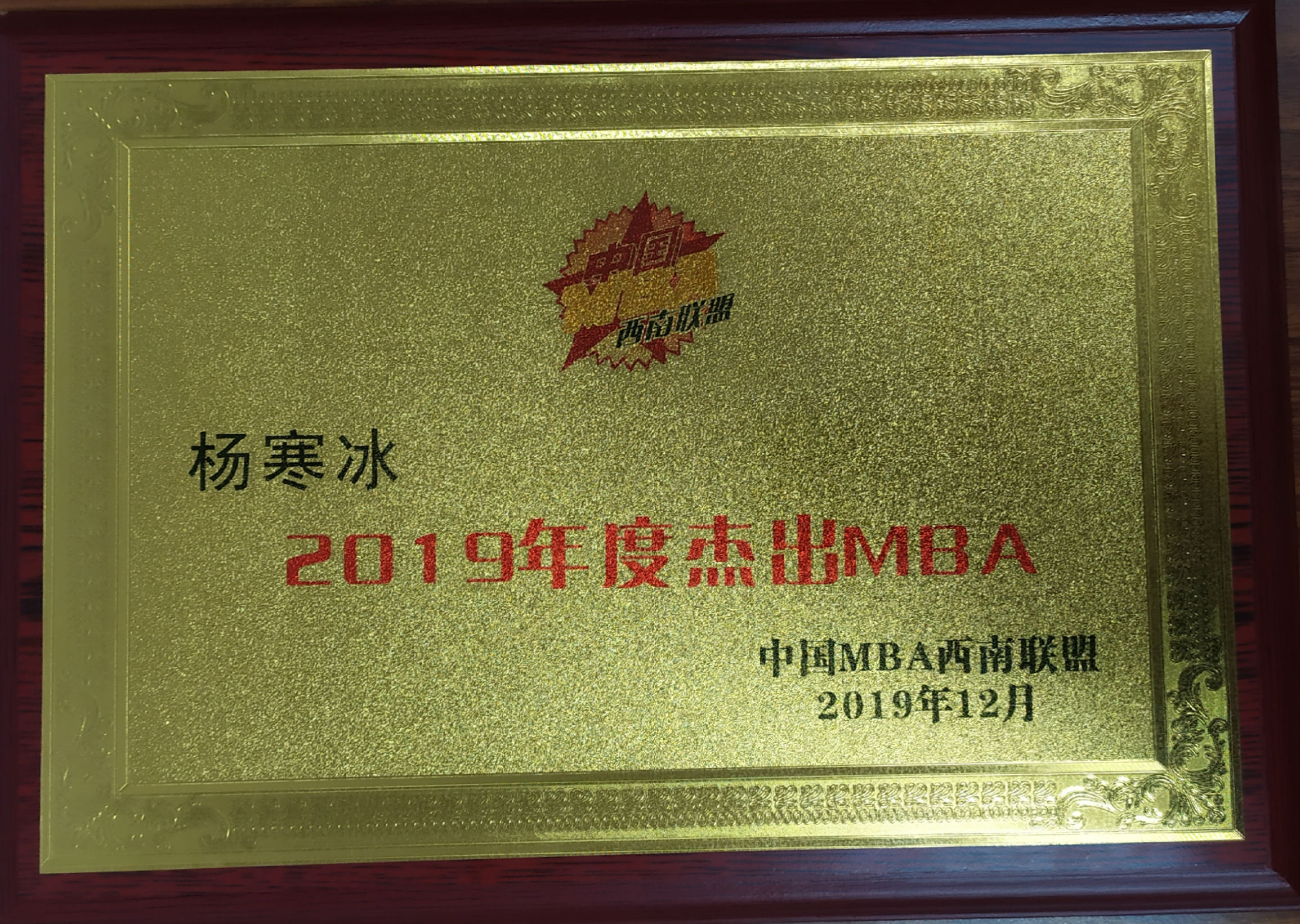 随后,中国MBA西南联盟对2019年联盟的先进集体和个人进行表彰。公司第八届MBA联合会杨寒冰副主席获得中国MBA西南联盟“2019年度杰出MBA学员”称号。