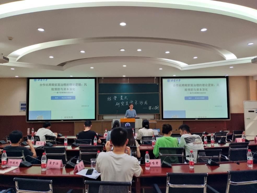 程丹分享论文《合作社跨期贫困治理的理论逻辑:风险预防与资本深化——基于多案例的比较分析》,文章研究得出合作社通过风险预防和资本深化能有效帮助农户脱贫、合作社参与贫困治理的方式具有阶段性、不同类型的合作社在参与贫困治理中具有异质性等结论。卜寒分享论文《家庭人口年龄结构与农村减贫》,文章研究发现未成年子女数量的增加显著抑制农村家庭减贫、老年人数量对农村家庭绝对贫困影响不显著等结论。