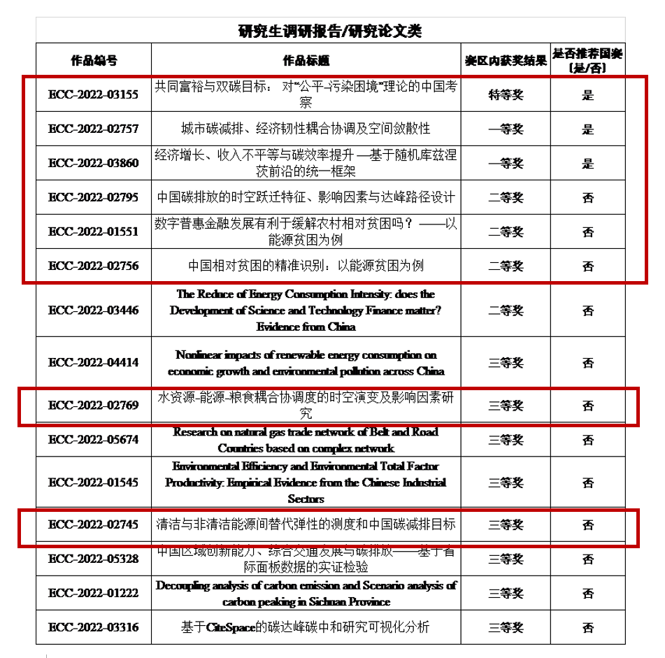 公司由bv伟德国际1946能源经济与政策团队刘自敏教授、杨丹教授和李玉婷副教授指导的员工在比赛中夺取多项奖项。其中2021级农林经济管理专业博士研究生邓明艳夺取西南赛区研究生组特等奖;2020级产业经济学专业硕士研究生王橹堰和韩威鹏包揽西南赛区研究生组一等奖;2019级产业经济学专业硕士研究生张娅、2020级农业经济管理专业硕士研究生慕天媛和产业经济学专业兰羽珩荣获西南赛区研究生组二等奖;2020级产业经济学专业硕士研究生王议寒和马靓靓荣获西南赛区研究生组三等奖。研究生组前三名邓明艳、王橹堰和韩威鹏将代表西南赛区参与全国研究生组总决赛。