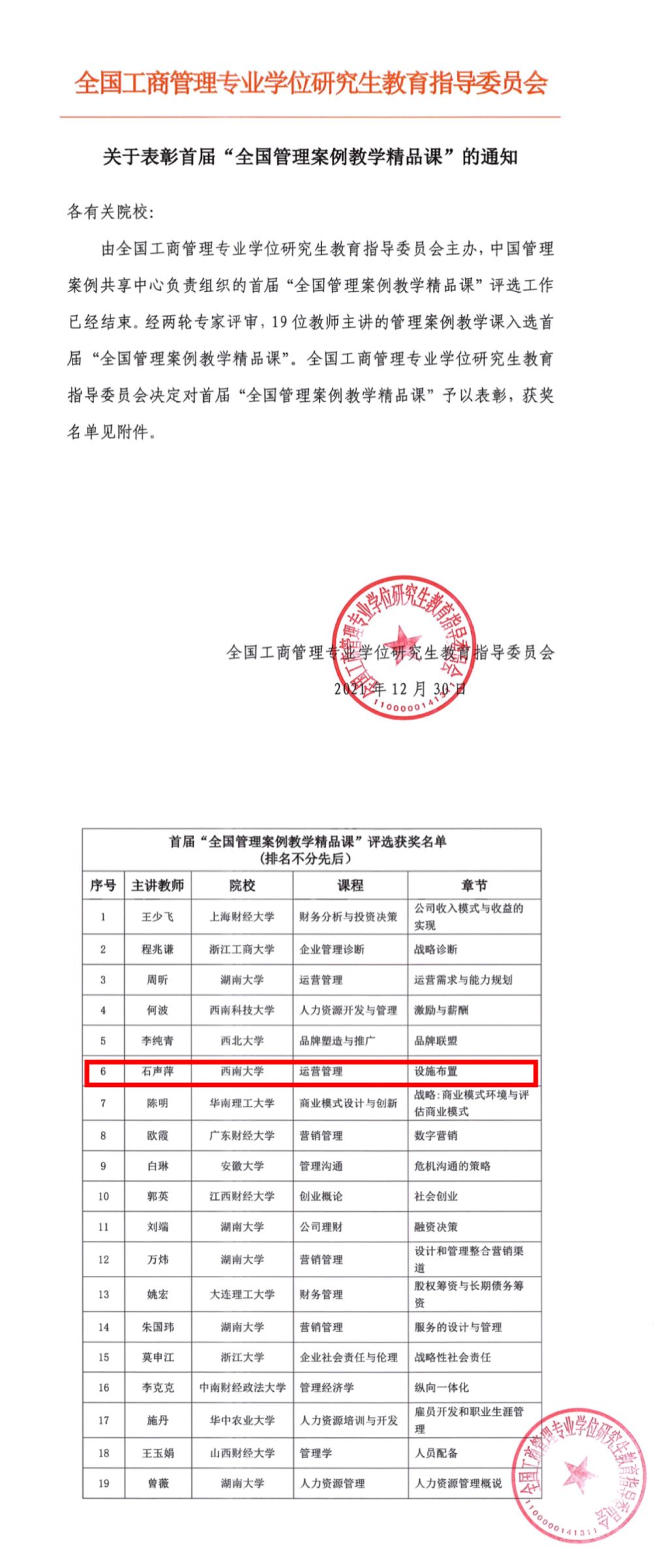 在首届“全国管理案例教学精品课”评选中,公司石声萍老师主讲的管理案例教学课《运营管理》成功入选“全国管理案例教学精品课”。