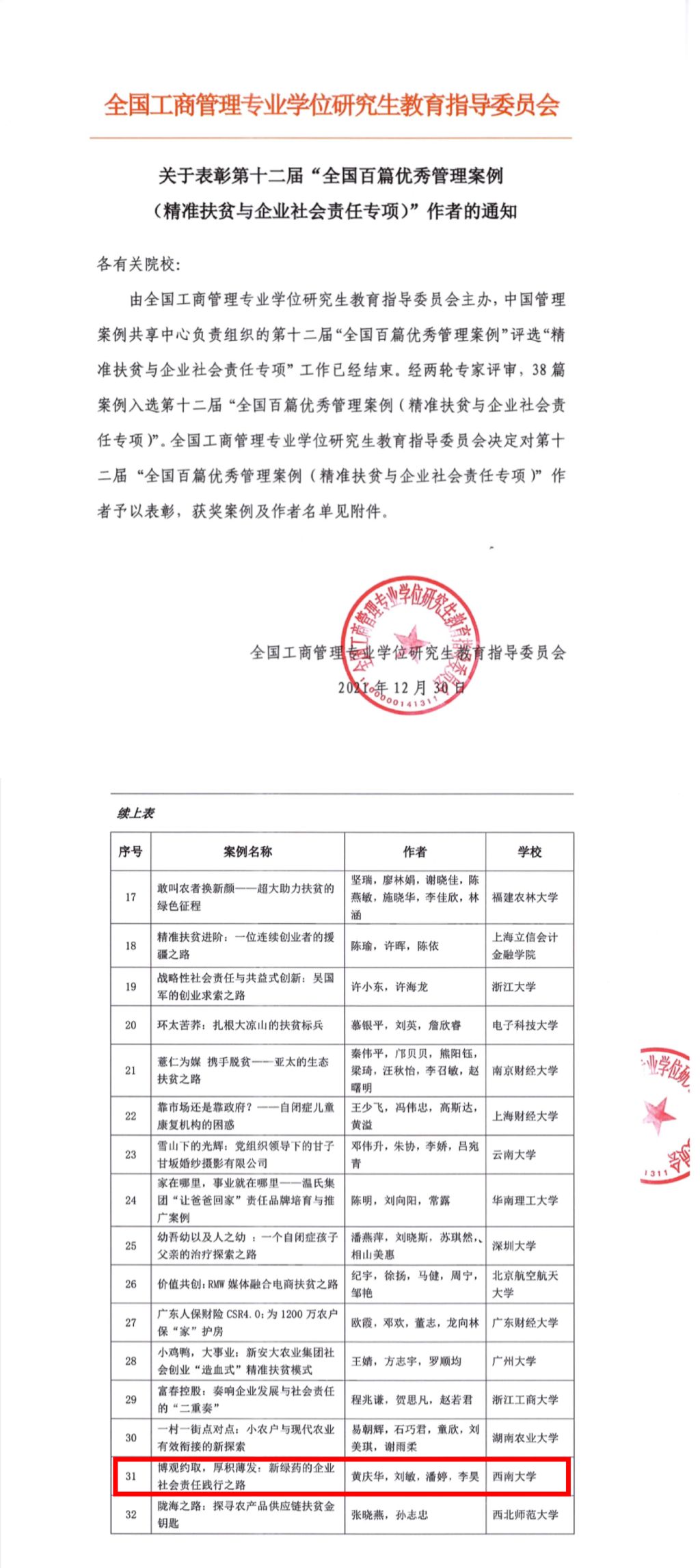 在第十二届“全国百篇优秀管理案例”评选中,MBA教育中心推送的案例中有6篇成功入选“全国百篇优秀管理案例”,分别是黄庆华、刘敏、潘婷、李昊团队撰写的案例《博观约取,厚积薄发:新绿药的企业社会责任践行之路》(精准扶贫与企业社会责任专项),石声萍、徐天娇、罗竟源、吴悠、谭畅团队撰写的案例《一碗燕窝的鲜炖之旅——小仙炖的产品和服务设计》(一般项目),谭畅、石声萍、刘林青、吴悠团队撰写的案例《“竞争性合作”抑或“合作性竞争”?——海信与日立联姻之路》(一般项目),毕茜、梁婷、王誉萱团队撰写的案例《从山寨到真香:拼多多品牌向上突围之旅》(微案例),杜勇、周知非、王昊、曹磊、蒋宗贵团队撰写的案例《“解”环保难题,“析”产业之路——忽米云析赋能庆云县危废产业》(微案例),罗超平、陈雯、曾令果团队撰写的案例《渝丰电缆:传统制造业的变革与创新发展》(西部专项)。