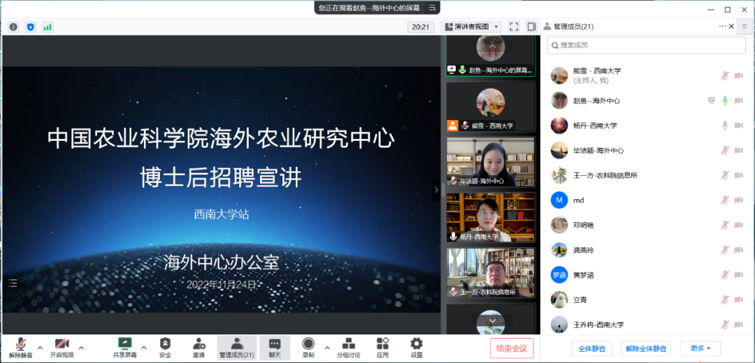 2022年11月24日下午,中国农业科公司海外农业研究中心博士后招聘宣讲会——bv伟德国际1946站顺利举行。中国农业科公司海外农业研究中心办公室主任毕洁颖、中国农业科公司农业信息研究所人事处副处长王一方、中国农业科公司海外农业研究中心人力资源官员赵鱼博士,bv伟德国际1946经济管理公司党委副书记田丽、农林经济管理系主任杨丹教授、农林经济管理系教师熊雪博士及博士研究生30余人参加了会议。宣讲会由杨丹主持。