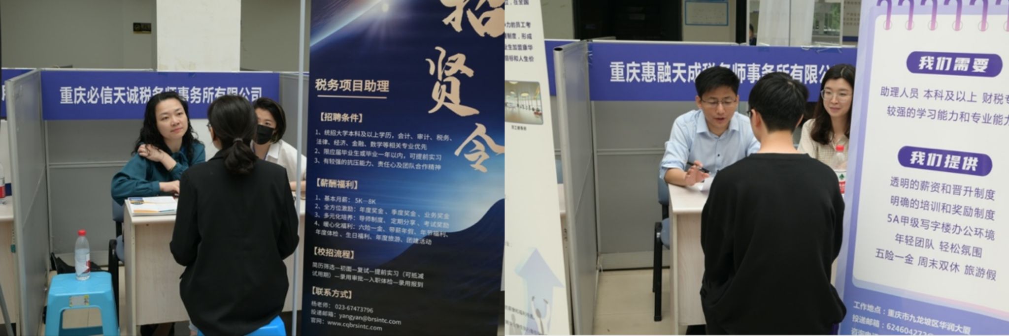 通过前期的积极宣传和深度挖掘开拓,本次专场双选会共得到中税网天运(重庆)税务师事务所有限公司、科信企业管理咨询集团有限公司、立信税务师事务所(重庆)有限公司等十四家税务师事务所的大力支持。据统计,本次双选会有近两百名公司应届毕业生来到现场应聘,此外还吸引了许多非毕业年级的同学前来与用人单位咨询交流,现场人头攒动、反响热烈,各用人单位累计收到求职简历126份,不少毕业生现场即与单位达成签约意向。
