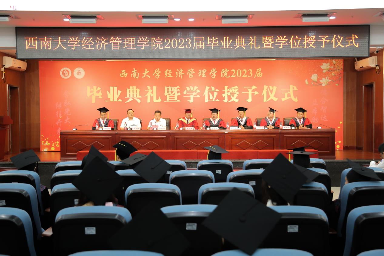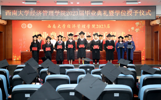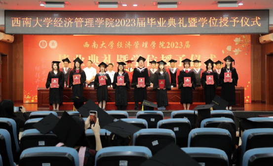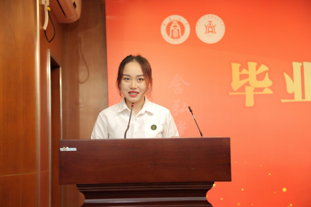 2023届会计专业何余霜作为本科毕业生代表发言,她回顾了四年老员工活的成长与收获,号召毕业生们踔厉奋发、勇毅前行,用实干和担当为母校和母院增光添彩,在实现中国梦的伟大实践中书写自己的精彩人生。2023届区域经济学硕士杨玉琪作为毕业研究生代表发言,她分享了自己从导师身上学到的甘坐冷板凳、潜心学术的“晒被子精神”,代表毕业生们对公司的精心培育、老师的谆谆教导表达衷心的感谢。2020级经济学专业的本科生王安作为在校生代表发言,她向即将远行的学长学姐送上了诚挚的祝福,祝愿他们在未来的征途中继续追随光、成为光、散发光,以远大理想、坚定信念和努力拼搏赢得精彩人生。