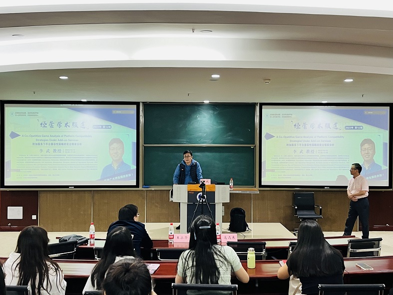 交流互动环节,与会师生就“同构附加组件服务对兼容性的影响”、“附加服务价格的确定”、“如何应对国际期刊审稿意见”、“怎样高效回复审稿意见”等问题与李武教授展开讨论。李武都耐心细致地进行了解答,并对国际高等级期刊论文发表进行了示例辅导。他贴近实际、深入浅出的讲解,让师生们收获颇丰,既对大型平台和小型平台的竞争与合作关系有了新的认识,又了解了国际高等级期刊论文审稿及修改过程,对今后发表国际期刊论文具有借鉴意义。