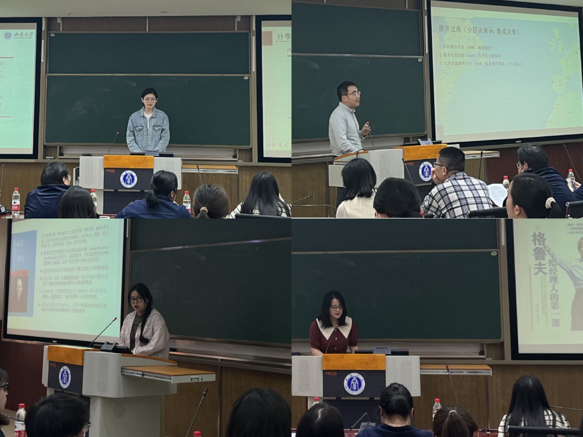 在经典著作分享环节,教师党员孙琳冰、史轩亚,研究生张涵洋、何艳逐一分享了《组织与管理研究的实证方法》《清教徒的礼物:那个让我们在金融废墟重拾梦想的馈赠》《13+1体系:打造持续健康的组织》《格鲁夫给经理人的第一课》等管理学方面的经典书籍,他们分别从作者概况、主要内容、核心观点、阅读感悟等方面对书籍进行了介绍。与会人员结合分享内容进行讨论发言,并号召大家要爱读书、多读书、读好书,做到精读与泛读相结合、理论与实践相结合,不断完善自身知识体系。