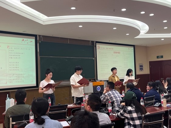 教师党员唐健、陶雅,研究生党员王博远,入党积极分子陈奕霏共同朗诵了诗歌《青春中国》。诗歌讲述了中国由弱到强的发展历史,字里行间表达了对祖国的热爱和对青年的赞颂。四位师生饱含着爱国主义深情,用铿锵有力的声音和慷慨激昂的语言,歌颂了伟大的党、伟大的民族。