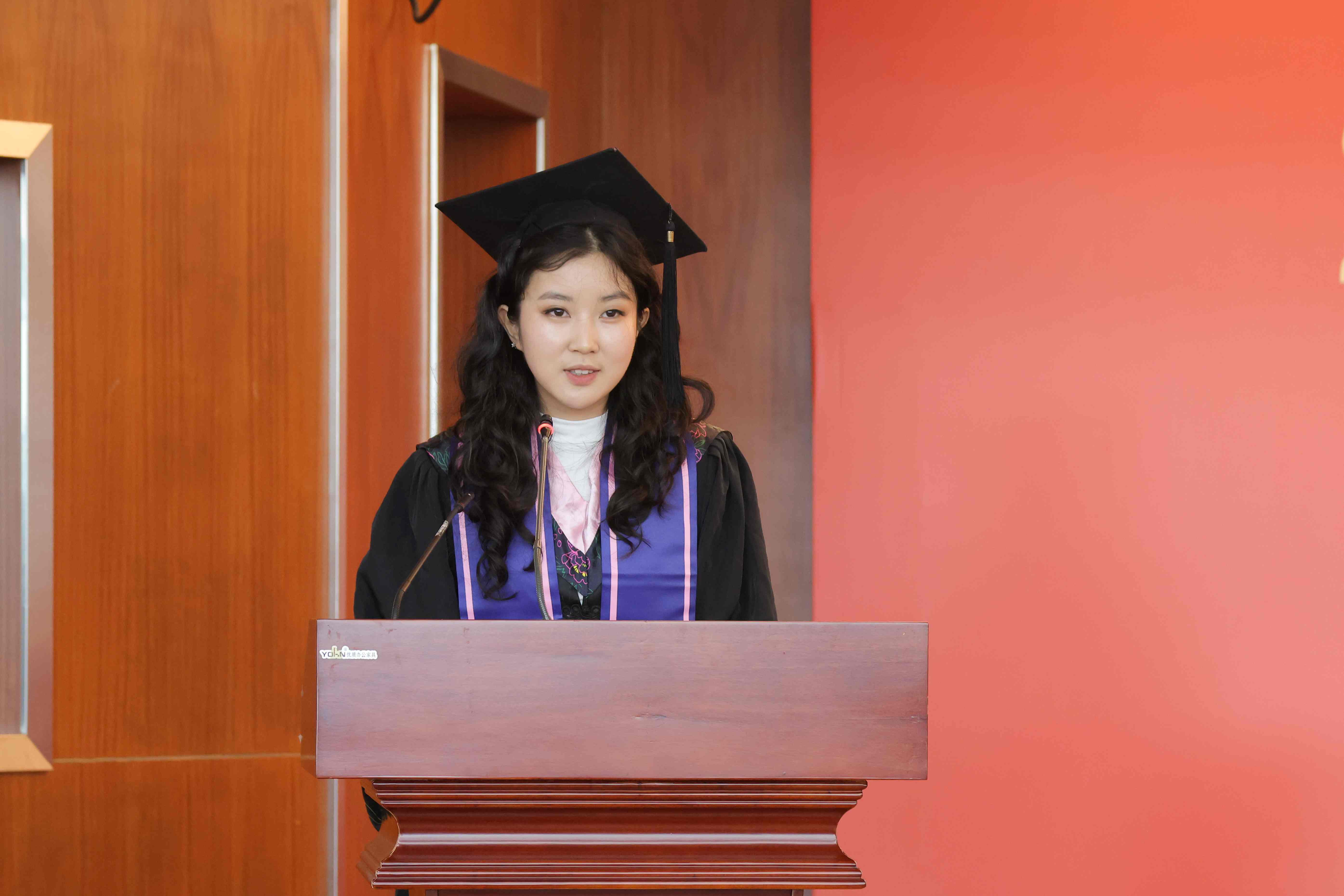 2024届金融学专业袁铭璐作为本科毕业生代表发言,她回顾了四年老员工活的成长与收获,对给予自己指导和帮助的老师、同学及父母表达了深深的感谢,并号召毕业生们带着“含弘光大、继往开来”的校训,带着“特立西南、学行天下”的精神,勇敢踏入社会的洪流,以国家情怀为指导,用实干和担当在实现中国梦的伟大实践中书写属于自己的壮丽篇章。2024届区域经济学硕士和杨亦兰作为毕业研究生代表发言,她回顾了自己“三步并两步走”的难忘求学经历,号召毕业生能够怀揣“不畏艰难,向上破局“的锐气、”不忘初心,向下扎根”的信念,把学术研究书写在祖国大地上,力争与时代同步,将个人梦想与民族复兴紧密连接,做有为的新时代青年。2021级金融学专业本科生蔡滢作为在校生代表发言,她感谢学长学姐给予的耐心指导和帮助,并送上了诚挚的祝福,祝愿他们眼中有光芒,脚下有力量,乘风扶摇三万里,踏歌奋进逐浪高。