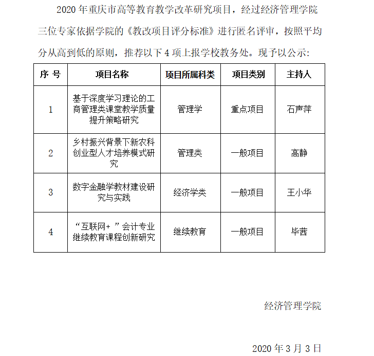 关于2020年重庆市高等公司产品改革研究项目推荐立项的公示