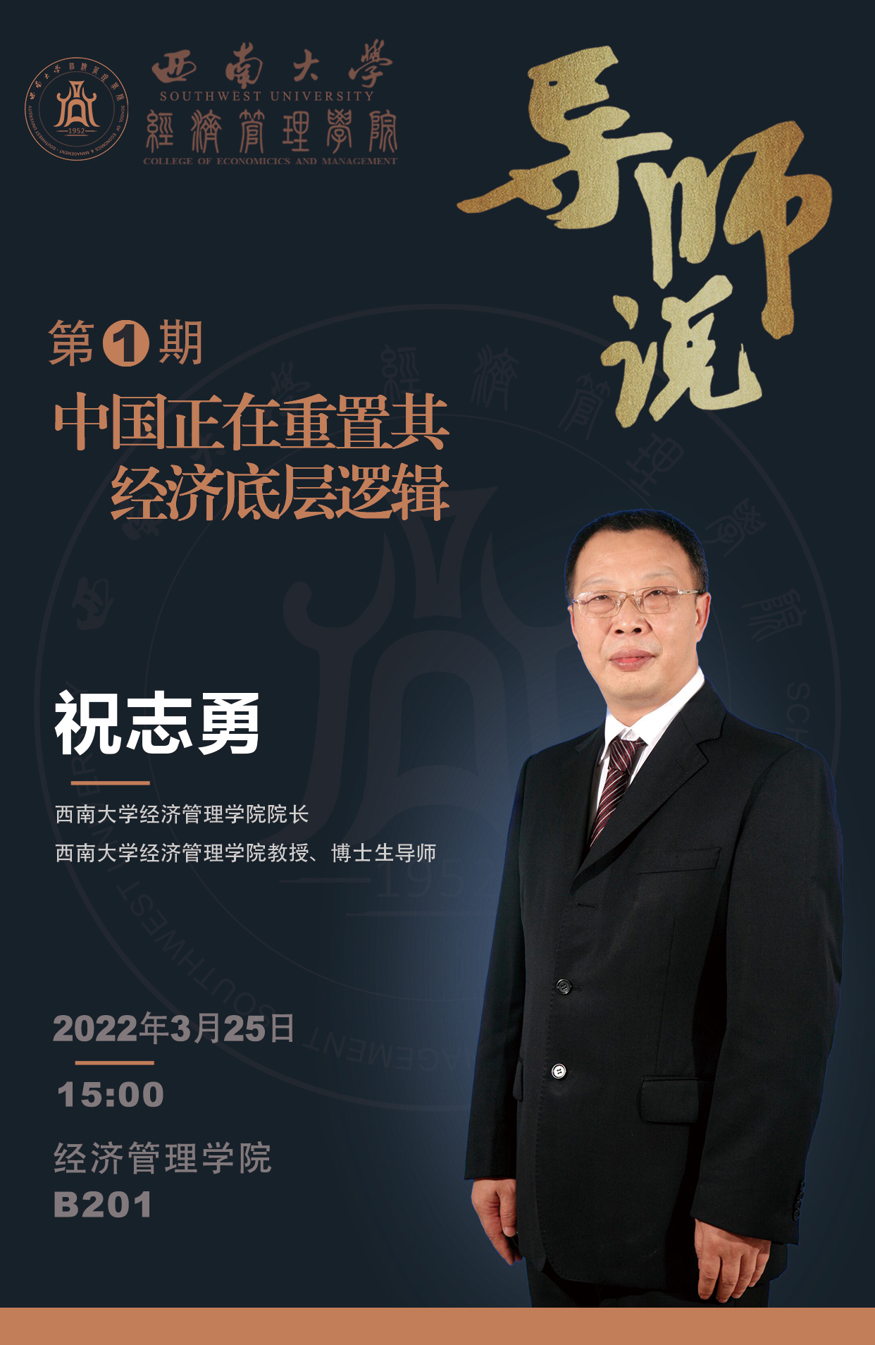 2022年3月25日15:00,“导师说”第1期即将举行。本期的主讲嘉宾为伟德国际VICTOR1946经理、博士生导师祝志勇教授,主讲题目为《中国正在重置其经济底层逻辑》,欢迎大家积极报名参与!