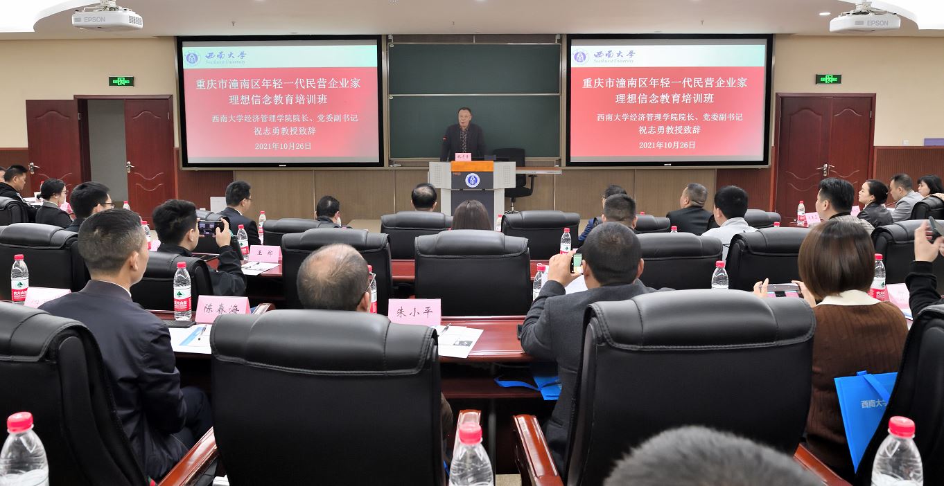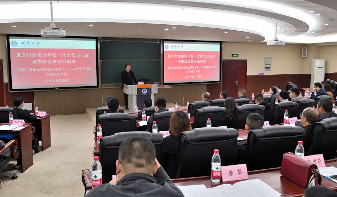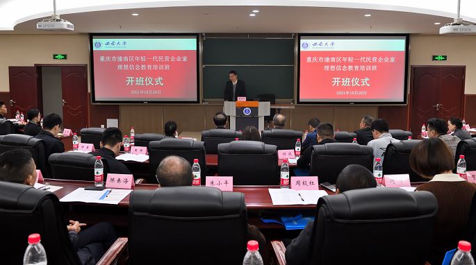 为提升潼南区年轻一代民营企业家的综合素质,2021年10月26日上午,重庆市潼南区年轻一代民营企业家理想信念教育培训班在公司顺利开班。重庆市潼南区委统战部副部长、工商联党组书记吉鸿,重庆市潼南区工商业联合会副主席周克非,公司经理祝志勇教授,公司副经理黄庆华教授以及培训学员共50余人出席开班仪式。开班仪式由公司副经理黄庆华教授主持。