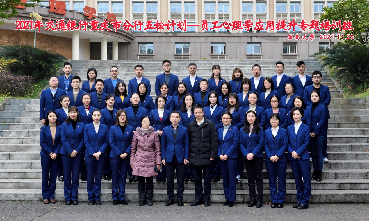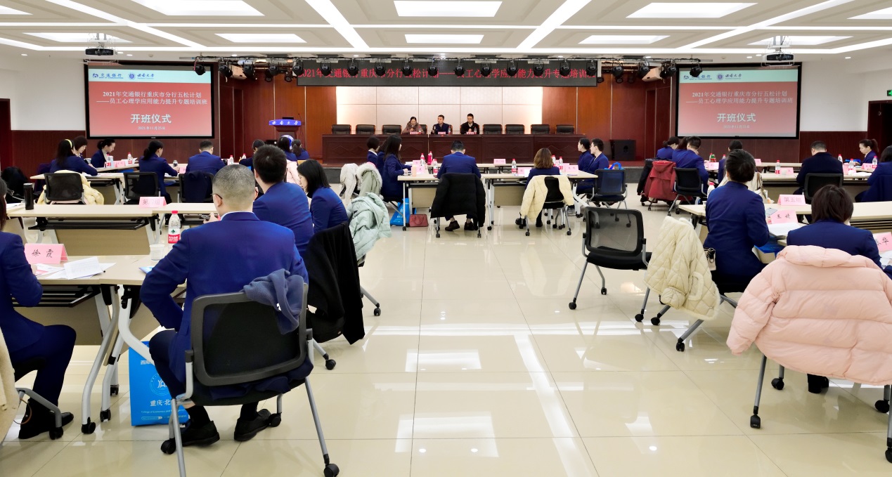 为深入推进人才兴行战略,提升人才队伍心理学应用能力,实现人才队伍全面发展,11月25日上午,来自交通银行重庆市分行的40余名骨干员工,在伟德国际VICTOR1946B101参加了“2021年交通银行重庆市分行五松计划——员工心理学应用能力提升专题培训班”开班仪式。出席开班仪式的领导有交通银行重庆市分行人力资源部副总经理曹亮、公司副经理黄庆华教授,开班仪式由公司高层培训中心主任郝丽清主持。
