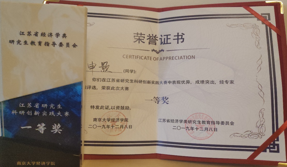 公司研究生申颢在江苏省研究生科研创新实践大赛中获一等奖